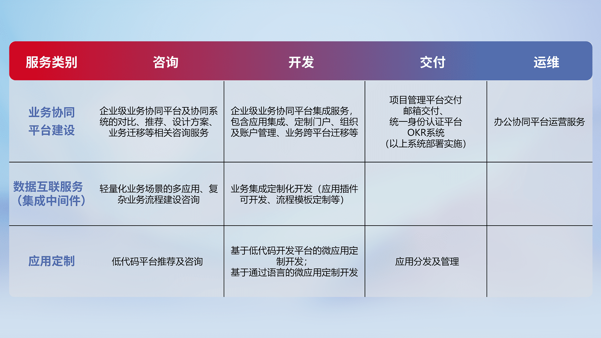 针对钉钉、、、、企微、、、IDaas等平台级产品提供产品的规划、、、、方案、、、交付、、、、定制化开发等服务,,,,实现如统一协同办公、、、、智能客户服务、、、、混合会议管理、、智能数据查询、、、等业务场景,,,实现数字化转型。。