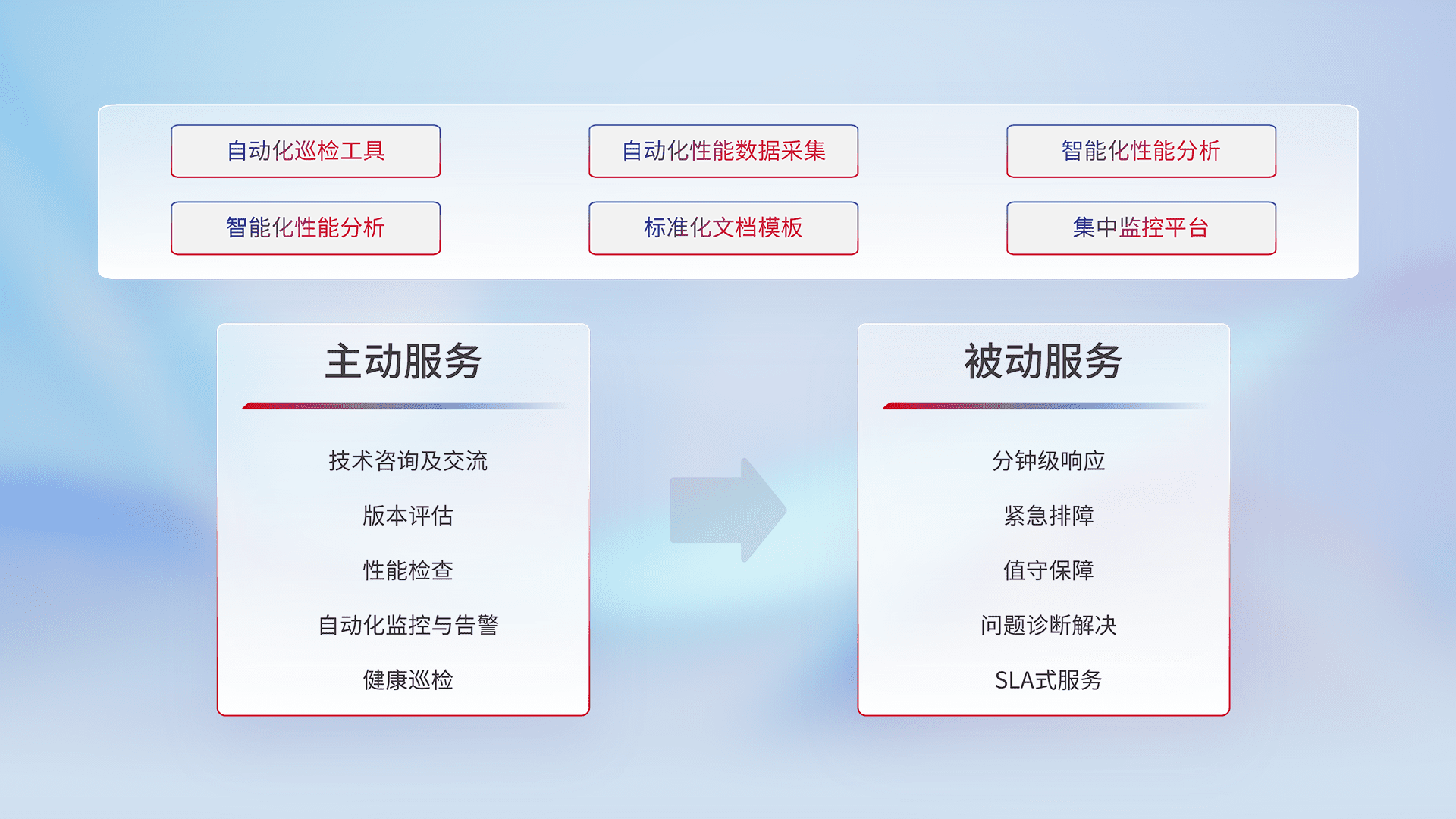 智能化工具和标准化文档,,,,保障服务质量,,提供主动服务(包含技术咨询、、、版本评估、、、性能检查、、、自动化监控与告警、、、健康巡检)和被动服务包含(分钟级响应、、、、紧急排障、、、值守保障、、、问题诊断解决、、、SLA服务)。。