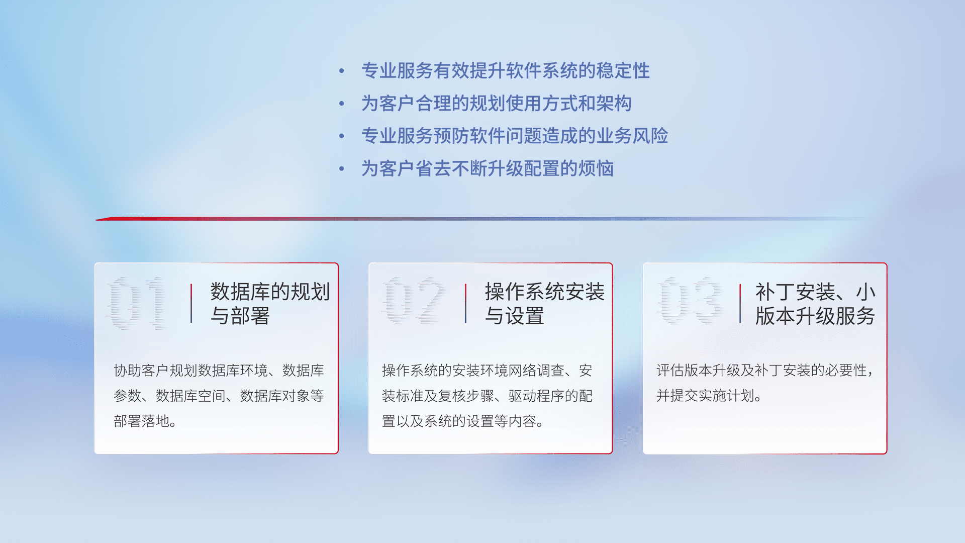 为客户提供软件规模升级、、快速部署、、、、按需配置的专业服务,,,从数据库的规划与部署到操作系统的安装与设置,,,再到补丁安装和小版本升级提供支持。。。